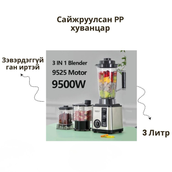 Гэр бүлийн хэрэгцээнд зориулсан 9500 ваттын хүчин чадалтай энэхүү блэндэр нь таны жимс ногоо, мөсийг төвөггүй хэдхэн секундэд бутална.